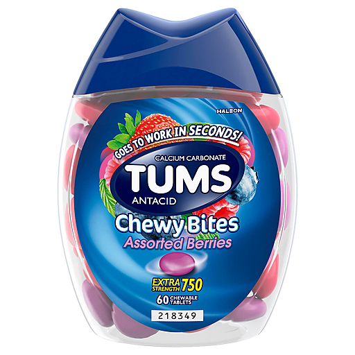 TUMS Chewy Bites Chewable Antacid Tablets go to work in seconds to make heartburn relief simple and delicious. When symptoms occur, take two to four chewable antacids, depending on the severity of your acid indigestion. Featuring the active ingredient calcium carbonate, these chewy antacids relieve heartburn, sour stomach, acid indigestion and provide upset stomach relief associated with these symptoms. Each chewable tablet delivers fast relief in every bite. With a delicious outer shell and soft center, these TUMS Chewy Bites come in three delicious assorted berry flavors. TUMS antacid tablets are the #1 recommended adult antacid brand by doctors, pharmacists and OBGYNs. As America's #1 antacid and trusted as a heartburn medicine for 90 years, TUMS is fully supported with a satisfaction guarantee. These antacid tablets are gluten free. These extra strength heartburn relief tablets come in a compact, recyclable bottle that's easy to stow for whenever heartburn strikes. With TUMS Chewy Bites, you get a tasty way to fast heartburn relief in every chewy bite.