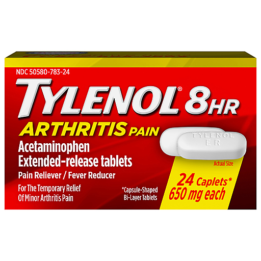 Tylenol 8 Hour Arthritis Pain Reliever Extended-Release Caplets temporarily relieve the minor aches and pains of arthritis, including arthritic joint pain in hands, wrists, knees, ankles, elbows and feet. The first layer of the bi-layer design delivers fast-acting medicine for quick minor arthritic joint relief while the second has an extended release, offering effective pain relief that lasts up to 8 hours. With 650 milligrams of the pain-relieving and fever reducing ingredient acetaminophen per caplet, this pain medicine also temporarily relieves aches and pains associated with muscular aches, backache, premenstrual and menstrual cramps, the common cold, headache, and toothache. This effective oral pain reliever is gentle on your stomach, but tough on minor arthritic joint pain and also works as a fever reducer. Made by the #1 doctor recommended OTC brand for pain relief and fever reduction, it can be used by adults 18 years older and is safe when used as directed.